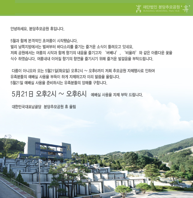 2013년 5월 21일(화) 예배실 이용안내 페이지 정보 작성자분당추모공원 휴 작성일15-03-09 17:04 조회수10,568회 댓글0건 이전글 다음글 목록 본문 글쓴이 : Huepark 조회 : 1,414 . 댓글목록 등록된 댓글이 없습니다. 이전글 다음글 목록